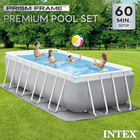 Enjoy endless summertime fun with the Intex 26791EH 16′ x 42″ Prism Frame Rectangular Above Ground Swimming Pool Set. This durable and stylish pool is designed for quick setup, ready for water in just 60 minutes. The powder-coated steel tubing and 3-ply pool walls resist punctures, ensuring long-lasting use for ages 6 and up. The set includes a 1,000 GPH filter pump for crystal-clear water all season, along with a convenient drain plug for easy maintenance. Complete with a ladder, ground cloth, and pool cover, this pool set is perfect for cooling off and relaxing with family and friends. Please check HOA rules before purchase.