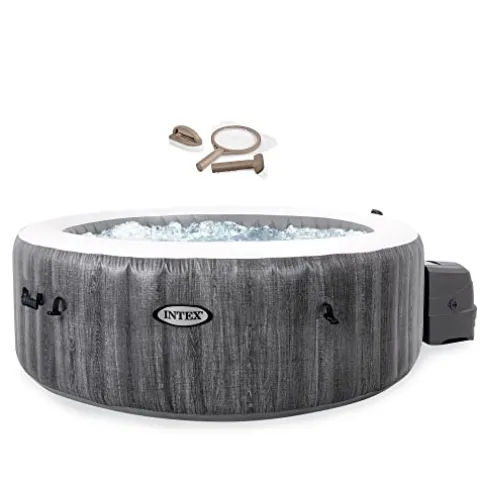 Experience ultimate relaxation and luxury with the Intex 28441EP PureSpa Plus 6 Person Inflatable Hot Tub Jet Spa. This outdoor spa accommodates up to 6 people and features 140 powerful jets for a soothing massage experience. With water temperatures reaching up to 104 degrees Fahrenheit, you can unwind in style at the touch of a button. The rechargeable touch display control panel allows you to schedule heating times and adjust the temperature effortlessly. Additionally, the included Intex PureSpa Maintenance Accessory Kit ensures optimal performance with a curved brush, mesh skimmer, and scrubber. Enjoy the convenience and comfort of a spa day in your own backyard with this Intex hot tub.