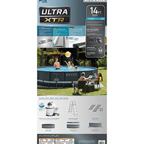 Enhance your outdoor living space with the Intex Ultra XTR Frame 14′ x 42″ Round Above Ground Outdoor Swimming Pool Set. This premium pool set by Intex features a stylish graphite exterior with a blue tile print, adding a touch of elegance to your backyard. Equipped with a sand filter pump, ladder, ground cloth, and pool cover, this set offers everything you need for a refreshing swim. The Hydro Aeration Technology in the filter pump ensures improved circulation and water clarity, while the galvanized steel frame and 3-ply PVC liner provide durability and strength. With an easy lock assembly system requiring no tools, this pool can be ready for water in just 45 minutes, offering a hassle-free setup for endless summer enjoyment.