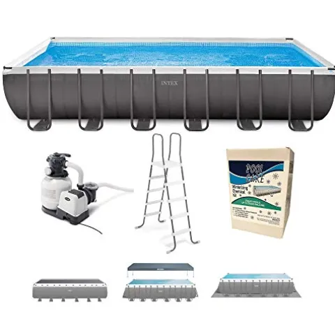 The Intex 26363EH 24ft x 12ft x 52in Ultra XTR Frame Outdoor Above Ground Rectangular Swimming Pool Set is the ultimate choice for your backyard oasis. This set includes a pump, ladder, pool cover, and winterizing kit, making it a complete package for a refreshing swim season. With its sturdy steel frame and durable construction, this pool offers reliability and longevity. The stylish blue and gray color combination adds a touch of elegance to your outdoor space. Enjoy endless fun and relaxation with this premium Intex swimming pool set.