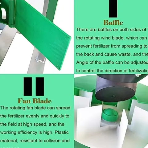 - Evenly Fertilizing:The rotating fan blade can spread the fertilizer evenly and quickly to the field at high speed, and the working efficiency is high, Plastic material.
