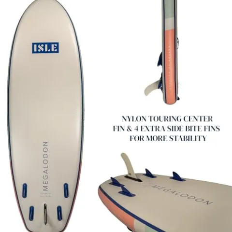 The ISLE Megalodon Inflatable Stand Up Paddle Board & iSUP Bundle Accessory Pack offers an exceptional water adventure for families, friends, and pets, with an impressive capacity of up to 1,050 lbs. Choose between the 12′ or the 15′ model, both boasting incredible stability for activities like paddling, yoga, and fishing. Crafted from Military-Grade PVC and featuring the AIRTECH FUSION LITE process, this board is both ultra-durable and lightweight, ensuring resistance to dings and maintaining performance. Transport is a breeze with 16 neoprene-padded carry handles, and the included accessory bundle—complete with an adjustable paddle, high-pressure pump, and snap-in travel fin—equips you fully for your aquatic adventures. Experience the expertise and passion of ISLE Surf and SUP, a San Diego-born brand devoted to quality and innovation since 2004.