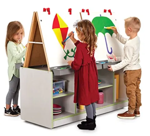 - KIDS ART CENTER – The key lime green trim art center features 4 Write-n-Wipe easel panels. It includes 4 paint trays, 8 clips, and 4 paint cup holders. The shelves and the space between the easels let you store paint, brushes, and other supplies.