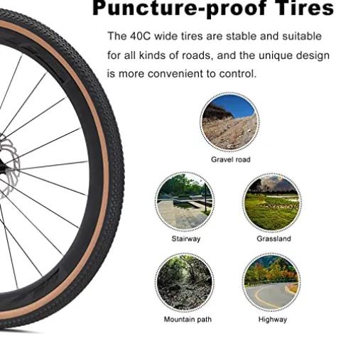 - 【RUGGED & PUNCTURE-PROOF TIRES】- Wider 700x40c tires for added versatility and stability on rougher terrain. Fast Rolling high traction tread for faster and more comfortable ride. Also, provides good grip on uneven surfaces like tarmac roads or pavement.