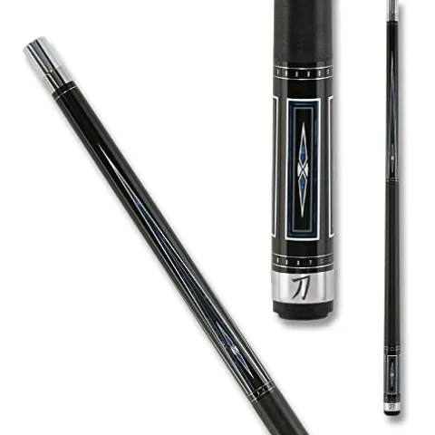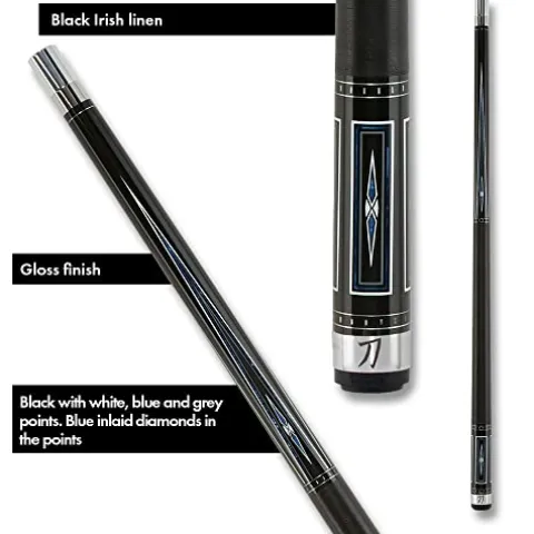 The KATANA KAT16 Pool Cue in Black Stained, White, Grey & Blue Inlays with Grey Rectangles and Blue Diamonds is a striking cue designed for precision and style. Featuring a 12.5mm Katana Tip by Tiger and a 29″ Katana Low Deflection Shaft, this cue offers exceptional performance for players of all levels. The sleek black forearm with white, blue, and grey points, along with blue inlaid diamonds, adds a touch of elegance to the design. The black Irish Linen wrap with double silver rings and dashes provides a comfortable and secure grip, while the black butt sleeve with white & blue inlays, grey rectangles, and white and blue diamonds inside completes the sophisticated look of this cue. Ideal for players looking for a cue that combines performance with visual appeal, the KATANA KAT16 Pool Cue is a standout choice for any game.