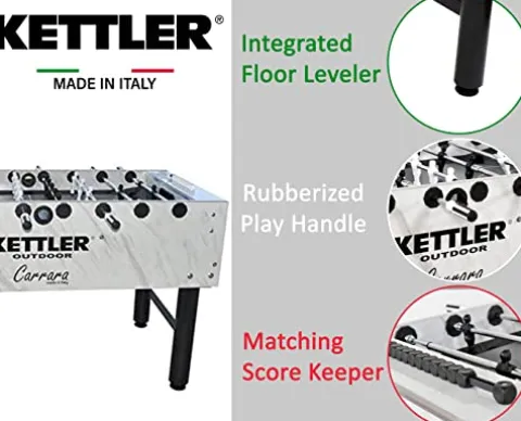 Experience the authentic Italian craftsmanship with the KETTLER Carrara Outdoor Foosball Table. This tournament-style table boasts a sleek design reminiscent of Carrara marble, with durable powder-coated steel legs. The steel telescopic rods feature anti-rust chromium plating for smooth maneuvering, while the elongated handles with rubber inlay ensure a comfortable grip for perfect shots. The foosball players are unbreakable and molded onto the rods, with a 360-degree rotating goalie for added excitement. Enjoy the melamine playing field, side and corner rails, ball pockets for easy retrieval, and nylon bushings for high-speed action. Complete with five resin balls, five cork balls, and a premium storage cover, this outdoor foosball table is ready for endless fun with family and friends.