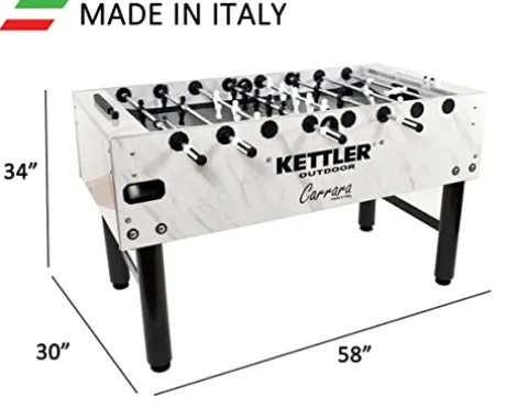- MADE IN ITALY – This outdoor foosball table features a tournament-style cabinet with a look that mirrors true Italian Carrara marble plus powder-coated steel legs. Assembled dimensions: 58 L x 30 W x 34 H inches/ Weight: 120 pounds.