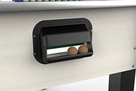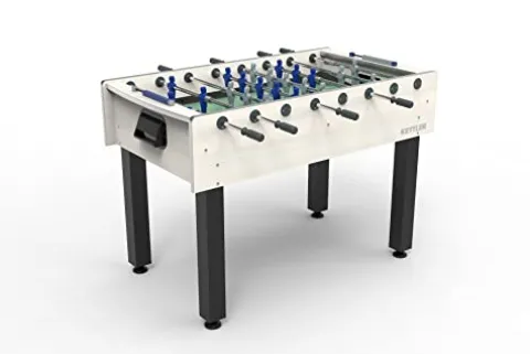 Experience the excitement of a competitive foosball match with the KETTLER Milano Weatherproof Indoor/Outdoor Foosball/Soccer Game Table in Navarra White Pine. This premium game table features a high-speed glass playing field with steel telescopic rods and anti-rust chromium plating for durability. The unbreakable players are molded on the rods, offering elongated playing handles and 360-degree goalie rotation for precise control. Nylon bushings ensure smooth high-speed action while reducing wear and tear. The table comes with five cork and resin foosballs and an all-weather cover for protection. With large powder-coated steel legs and floor levelers, this table is built to last. Made in Italy, this foosball table measures 52”(L) x 46”(W) x 35”(H), weighs 115 lbs., and comes with a 3-year residential warranty.