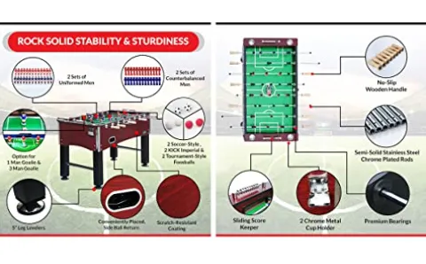 Experience the thrill of competitive foosball with the KICK Royalton 55″ Foosball Table in striking red. Crafted by the renowned brand KICK, this table boasts a sturdy build with dimensions of 55″ L x 30″ W x 36″ H. It includes both a Counter Balanced Men Set and a Uniformed Men Set for versatile gameplay. The table is not only durable but also exudes elegance, making it a stylish addition to any game room. Plus, with a lifetime warranty on new tables purchased from KICK, you can enjoy endless matches with peace of mind.