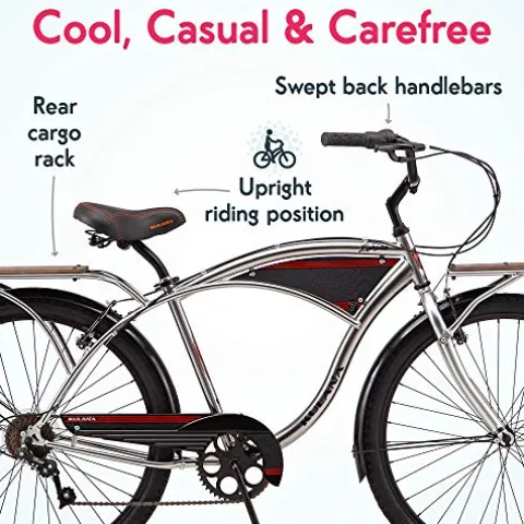 Ride in style and comfort with the Kulana Lakona Tide Adult Beach Cruiser Bike. This 26-inch wheel cruiser features a durable steel frame, perfect for leisurely rides on the beach or around the neighborhood. The single-speed drivetrain ensures easy maintenance, while the rear coaster brake offers intuitive stopping power. Stay clean and dry with the fenders that also add a touch of vintage charm. The extra-large spring saddle and upright riding position provide a comfortable and relaxed experience, making every ride a joy.
