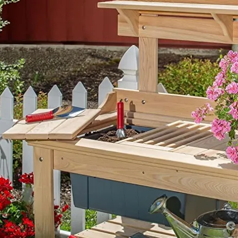 The Lehman’s Outdoor Gardening Potting Table Workstation combines functionality and durability, making it an essential addition to any gardener’s setup. Crafted from smooth-sanded, unfinished cypress wood, this brown workstation not only enhances your outdoor space but also withstands the elements. Featuring stainless steel fasteners for added strength, it includes a tough removable tote that holds up to 14 gallons, perfect for storing tools and supplies. The interchangeable and removable solid and slatted inserts allow for easy customization, while the 34-inch height provides comfortable working conditions. Elevate your gardening experience with this versatile and stylish potting table.
