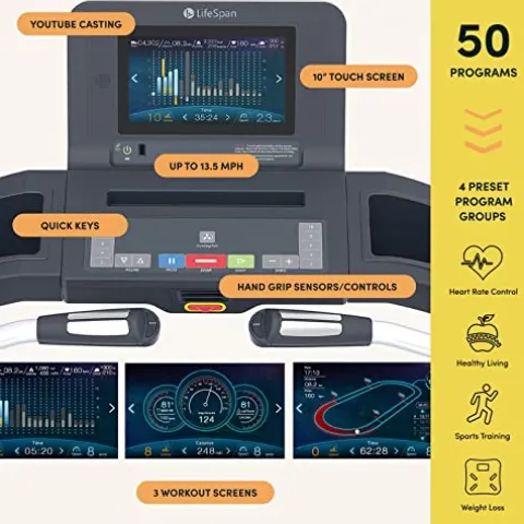Enhance your home workout experience with the LifeSpan Fitness TR5500iM Home Treadmill. Featuring a 10″ full-color touchscreen and phone mirroring ability, this treadmill in black offers endless entertainment options with Bluetooth speakers and YouTube screencasting. With over 50 programs, fitness tests, and training programs, along with a spacious running surface and 8 compression shocks for joint comfort, the TR5500iM caters to all training styles. Powered by a robust 4.0 HP motor, this treadmill ensures a smooth and powerful workout every time. Elevate your fitness routine with the TR5500iM treadmill from LifeSpan.