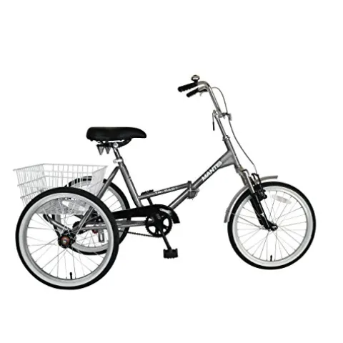 The Mantis Tri-Rad 20 Inch Wheels Single Speed Adult Folding Tricycle in Silver offers a convenient and comfortable ride for adults. This tricycle features a folding steel frame with a steel suspension fork, ensuring durability and smooth handling. The aluminum rims with 20 x 1.75 inch white wall Kenda tires provide a sturdy grip on various terrains. With a single-speed drivetrain and one-piece crank, this tricycle is easy to use and maintain. The front v-brake with parking brake, easy adjust steel stem, and large comfort saddle enhance the overall riding experience. Additionally, it comes equipped with practical accessories such as a front fender, rear basket, parking brake, bell, and chainguard, making it a versatile choice for leisurely rides. Folded dimensions of 35″L x 30″W x 31″D ensure convenient storage and transportation when not in use.
