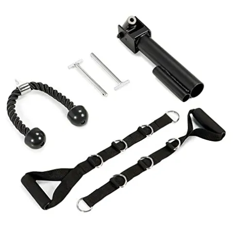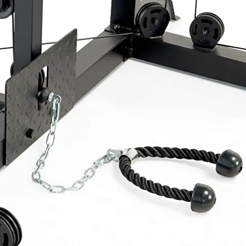 - Specifications: Includes adjustable and removable dip bars, cable handles for cable crossovers, landmine attachment, and a triceps rope for triceps extensions; Measures 70 x by 84 by 86 inches