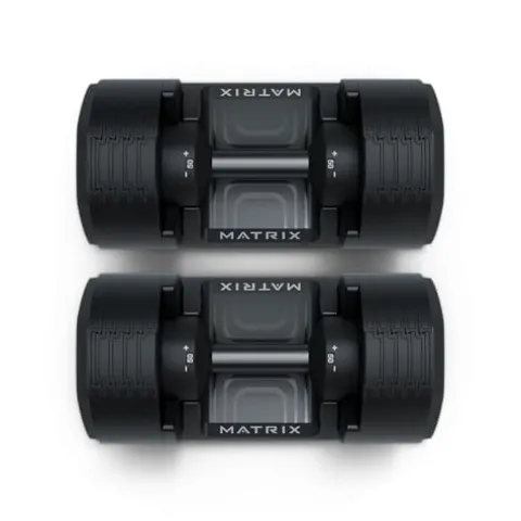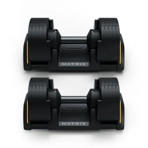 Elevate your home workout with the Matrix Fitness DB50 50 lb. Adjustable Dumbbells. Offering versatility and space-saving convenience, these dumbbells feature a handle twist mechanism that lets you adjust the weight in 5 lb. increments, effectively replacing 10 traditional dumbbell pairs. The knurled metal handle ensures a secure grip, while the flat-bottom weight plates prevent unwanted rolling. Sleek in black, these dumbbells come with sturdy cradles for easy storage, and an optional rack is available for purchase to enhance organization. Ideal for both beginners and seasoned lifters, the DB50 set delivers a premium gym experience right in the comfort of your home.
