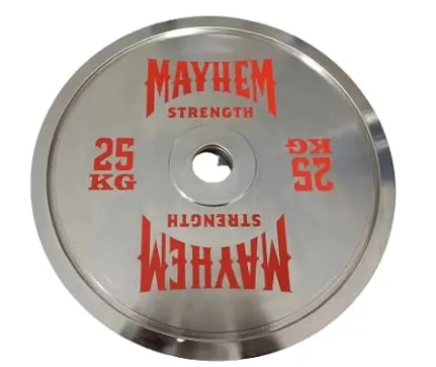 The Mayhem Strength Chrome Calibrated Plates, designed as a 25KG pair, provide an exceptional tool for full body workouts, enabling a range of strength training options through compound movements. Perfect for Olympic weightlifting, powerlifting, and bodybuilding, these versatile plates add intensity to functional fitness and traditional routines. Proudly crafted by a veteran-owned, small American business from San Diego, these plates not only enhance your gym sessions but also support a community dedicated to mutual growth and resilience. Elevate your training regimen with these expertly designed, high-quality weight plates, and become part of a legacy that forges strength and builds legends.