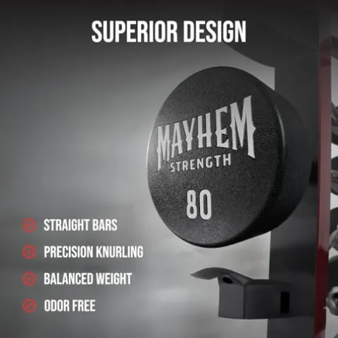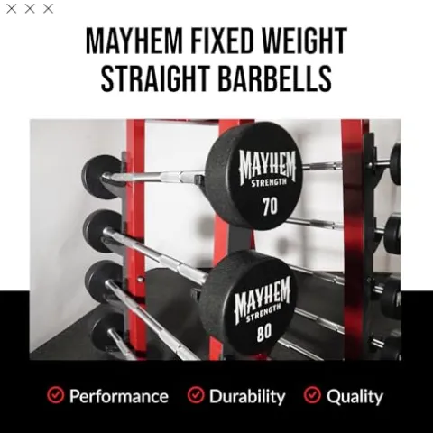 - FIXED WEIGHT BARBELLS – The Mayhem Strength Fixed Weight Straight Barbell Set has ten fixed-weight barbells pre-loaded and perfectly balanced in 10-pound increments from 20 to 110 pounds. The fixed-weight design allows you to focus on your form and technique without the hassle of adjusting weights.