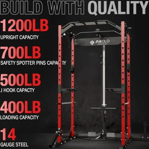 The Mikolo Power Cage, Power Rack in striking Red color, is a versatile workout cage designed for home gyms. With a 1200-pound capacity and constructed from heavy-duty 2×2-inch commercial steel tubing, this F4-301 model provides stability and durability for a wide range of exercises. The machine comes fully equipped with various attachments, including handle attachments, safety spotter pins, dip bars, and more, offering comprehensive workout options like lat pull-downs, rows, bench presses, and squats. Despite its robust features, the compact design of the F4 saves space while providing ample storage options with weight storage pins, barbell holders, and handle storage hooks. This power rack also boasts comprehensive upgrades such as adjustable heights, reinforced dip bars, and secure weight plate holders, making it a top choice for fitness enthusiasts looking to elevate their home workout experience.