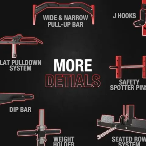 - [Fully Equipped & Versatile] Comes with numerous attachments, including 4 free handle attachments, 2 safety spotter pins, dip bars, j hooks, and T-bar row attachment. This provides a wide range of exercises, such as wide & narrow lat pull-downs, T-bar rows, seated cable rows, bench presses, squats, deadlifts, bicep curls, triceps extensions, pull-ups, chin-ups, dips, and more. And added 4 carabiner clips, 2 extension chains for cables, and 2 weight holder clips.