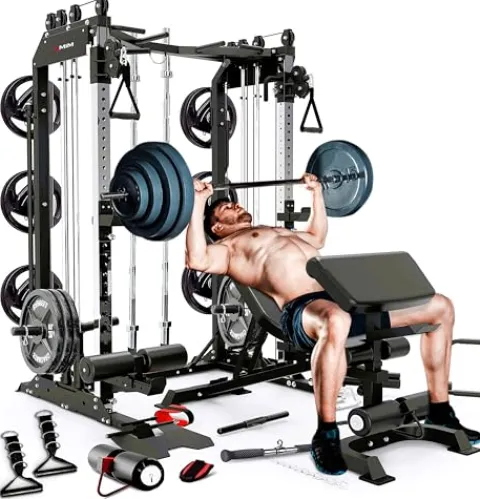 - Full Attachments:V-Handle, W-type bar, Chin Up Handles, Strap Handle, Olympic-Weight Plate Storage Bars, 2x Short and long Safety Catch, Foot Plate, Rotating Bar, Ankle Strap, Triceps Pull Rope, Push Bar, Handle Grips, T-Bar Row Landmine, Arm Workout Tube, Knurl, Straight Bars.(Weight Plates Not Included)