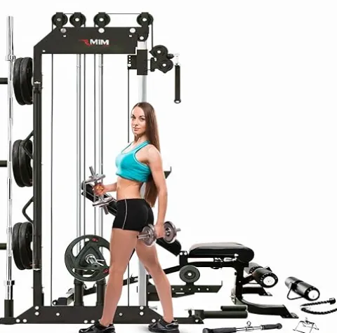 Experience a complete gym workout with the MiM USA Pro Master 1001 Smith Machine Functional Trainer. This all-in-one gym machine combines six pieces of equipment into a compact design, including a power cage, cable machine, chin-up dip station, low row, and core trainer. The machine comes with a range of attachments such as V-Handle, W-type bar, Chin Up Handles, and more to enhance your workout sessions. With a weight capacity of 555 lbs and a sturdy frame backed by a 5-year warranty, this versatile and safe machine is perfect for your home gym setup.
