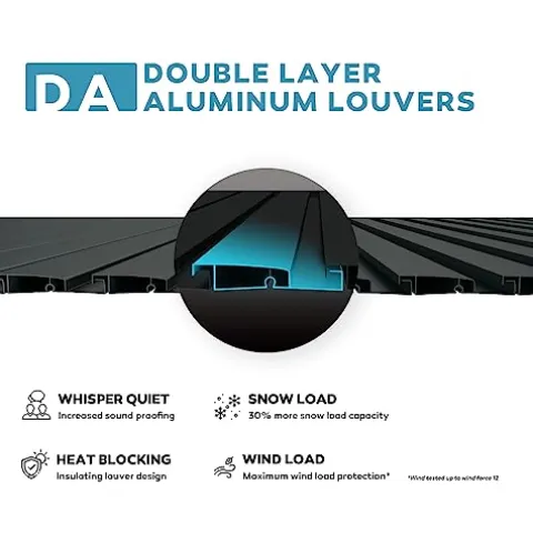 - Full Aluminum with Double Layer Aluminum Louver – Crafted with high-quality aluminum, the Mirador pergola is built to withstand the test of time. With a weatherproof double-layered aluminum louver design, it creates an optimal environment by shielding your outdoor space from heavy rain, snow, and other harsh elements with increased sound dampening and heat blocking qualities.