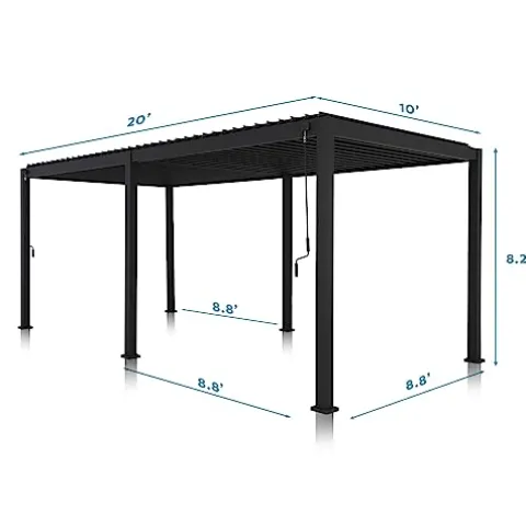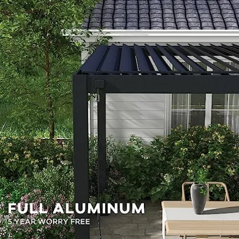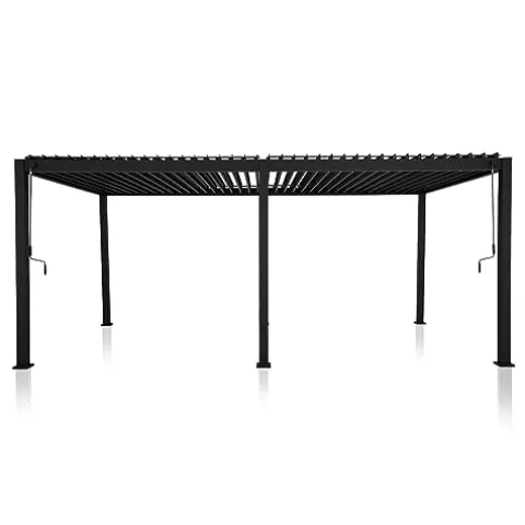 - Bioclimatic Pergola with Open and Close Louvered Roof – The Bioclimatic Pergola is equipped with an easy-to-use crank system that allows you to effortlessly open and close the louvers from 0° to 100°, giving you complete control over the amount of sunlight, ventilation, and shade.