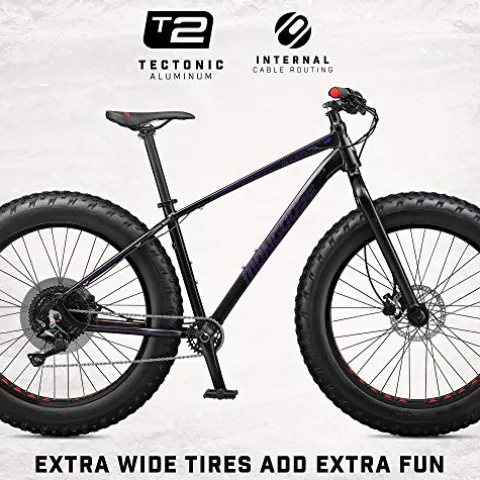 Conquer any terrain with the Mongoose Argus Sport Adult Fat Tire Mountain Bike. This sleek black bike features a Tectonic T2 aluminum frame that combines strength with lightweight agility for a responsive ride. Equipped with a 10-speed derailleur and shifter, this bike effortlessly adapts to various terrains. The hydraulic disc brakes deliver reliable stopping power in all weather conditions, while the large 26 x 4.8-inch tires ensure maximum traction, even on snow or sand. With internal cable routing for a clean look and added protection, this bike is perfect for riders 5’7″ to 5’10” seeking adventure and performance.