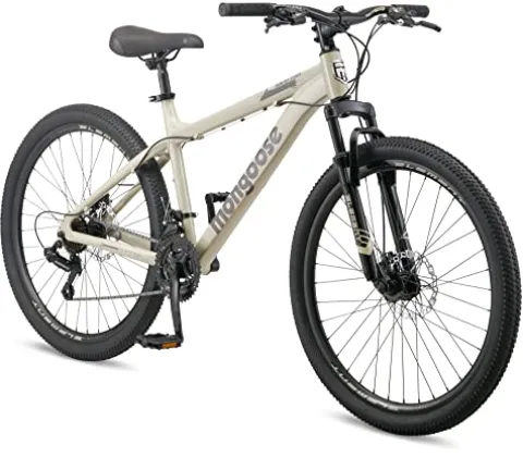 The Mongoose Grafton Mountain Bike offers both men and women a thrilling off-road riding experience. Its durable 17-inch aluminum frame with modern geometry is designed for rugged mountain trails, complemented by a hardtail frame and suspension fork for a smooth ride. With a 21-speed drivetrain and mechanical disc brakes, this bike ensures precise gear changes and reliable all-weather stopping power. The 26-inch wheels and 2.3-inch wide knobby mountain tires provide excellent grip and stability, while the aluminum double wall rims offer lightweight strength. Get ready to conquer any terrain with this stylish tan-colored mountain bike from Mongoose.