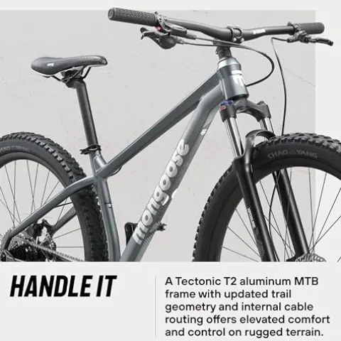 The Mongoose Switchback 2 Mountain Bike offers a seamless blend of performance and comfort for both men and women who love tackling rugged trails. Its lightweight aluminum frame, complete with internal cable routing, ensures a sleek, modern look, while the sloping top tube design keeps you stable with a low center of gravity. Enjoy smooth gear transitions with the 9-speed drivetrain and trigger shifters, and maintain control with the reliable hydraulic disc brakes, perfect for all-weather conditions. The 100 mm travel fork absorbs trail bumps effortlessly, and the Mongoose MTB saddle provides lasting comfort on extended rides. With 29-inch wheels and a 16-inch medium frame, this grey powerhouse is designed to elevate your mountain biking experience.