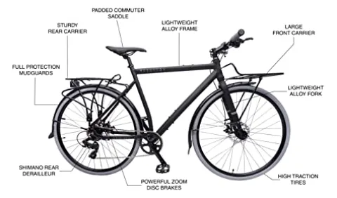 Ride through the urban jungle in style with the Muddy Fox Gridlock Equipped Urban Bike. Featuring a sleek black aluminum frame with ample mounts for all your essentials, this medium-large bike offers a comfortable and efficient ride. The Shimano Tourney 7 speed derailleur and mechanical disc brakes ensure smooth gear changes and reliable stopping power. With included front and rear racks, fenders, and a range of other extras, this bike is ready for any adventure. Enjoy the road ahead with the Muddy Fox Gridlock Equipped Urban Bike.