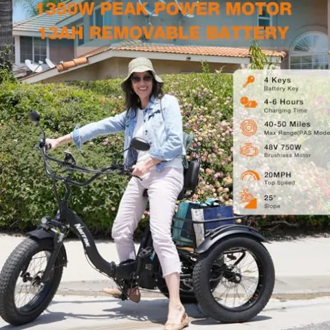 - Peak Performance & Advanced Control: Unleash robust power with the Narrak trike’s 750W motor, peaking at 1350W. Equipped with a rear central hub motor and an innovative differential system, it ensures different speeds for the rear wheels, enhancing maneuverability and stability, especially during turns.