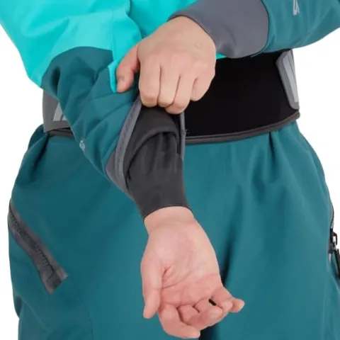 The NRS Women’s Phenom GORE-TEX Pro Dry Suit in Aqua, XS offers top-tier protection for water sports enthusiasts. Crafted with 3-Layer GORE-TEX Pro fabric, this dry suit ensures waterproof, windproof, and breathable performance. Its eco-conscious design features recycled fabric for minimal environmental impact. The neoprene waist overskirt with a hook-and-loop closure provides a tailored fit and excellent seal against water. With a back-entry zipper and protective flap, this suit minimizes bulk, enhances mobility, and prevents water from pooling, making it an ideal choice for staying dry and comfortable during aquatic adventures.