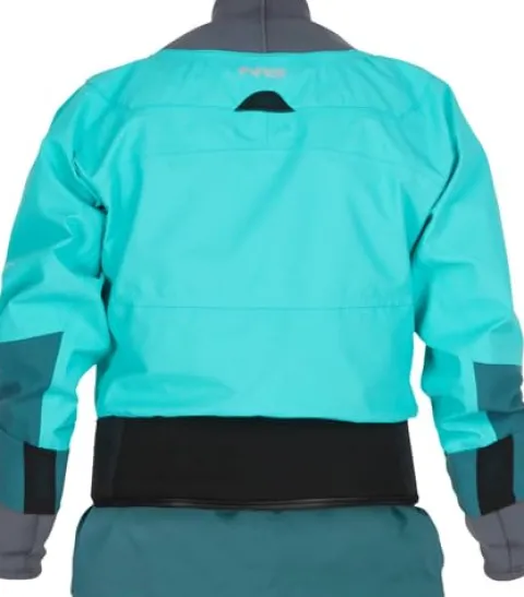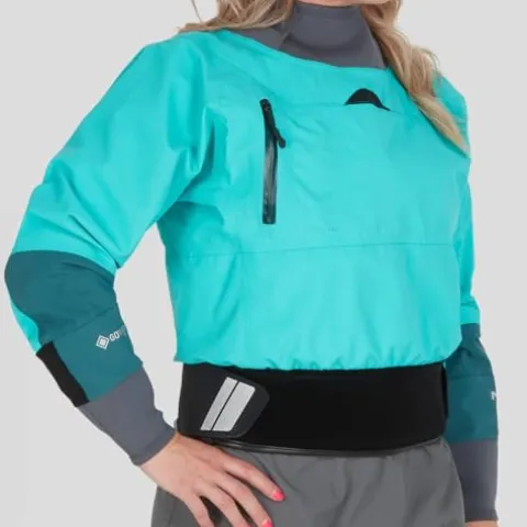 Stay dry and comfortable on the water with the NRS Women’s Rev Gore-TEX® Pro Kayaking Dry Top in Mediterranea/Aqua. Made with 3-Layer GORE-TEX Pro fabric, this dry top offers top-notch waterproof, windproof, and breathable performance. The Paddler’s Cut provides a tailored fit for athletic performance with room to layer underneath, while the GlideSkin neoprene overcuffs protect the latex neck and wrist gaskets. Designed to keep you dry in high volume waters, the volcano-style overcuffs cover more surface area to reduce water contact with the gaskets. Featuring mesh holes under the wrists and neck to drain water, an inner skirt with dual-adjust neoprene waist, and a splashproof, zippered chest pocket, this dry top is a must-have for any serious paddler.