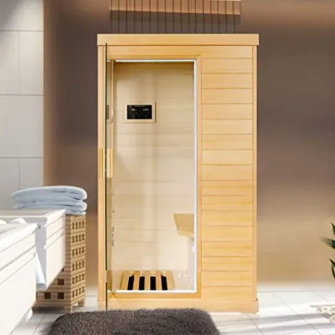 - Good materials:This gorgeous sauna is constructed with high-quality Natural Canadian Hemlock wood. A beautiful and durable wood that serves as an excellent heat insulator. Its glass is tempered for reliable longevity. The intelligent entertainment system is equipped with two high-quality speakers.Small size, low space requirements. Convenient and worry free. Bluetooth code: 0000. Size:61.61*35.24*27.56.