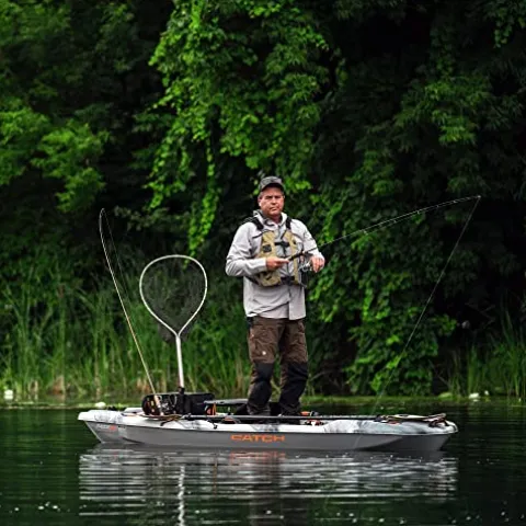- PREMIUM FISHING FEATURES: This fishing kayak comes equipped with two 4″ rigging tracks to set up your accessories. Bring all your essential fishing gear on board thanks to this kayak’s multiple storage features, such as front and rear tank wells and two bottle holders. Additional premium features in this fishing kayak include three flush mount rod holders, and an anti-slip deck carpet. This kayak comes with two paddle/rod tie-downs for when you need to free your hands.