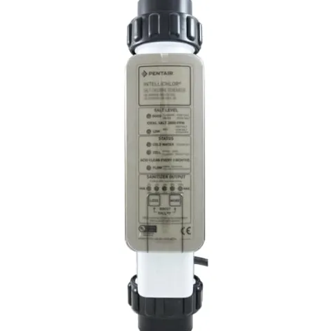 The Pentair EC-520554 Salt-Chlorine Generator in Almond is a reliable and efficient solution for sanitizing pools up to 20,000 gallons. With a chlorine output of 1.40 lbs every 24 hours, this generator ensures clean and safe pool water. Equipped with a built-in control display, monitoring salt levels and sanitizer output is easy. The titanium electrode cell blades coated with ruthenium oxide offer exceptional durability. The 2″ union inlet and outlet connections allow for quick and simple cell replacement. Additionally, the LED indicators and display provide clear visibility, while the threaded unions contribute to energy efficiency and eco-friendly pool maintenance.