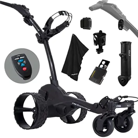 - [MGI ZIP NAVIGATOR ALL TERRAIN ELECTRIC GOLF CART BUNDLE] – MGI Zip Navigator AT Electric Golf Cart, 36-Hole Lithium Battery, Drink Holder, Umbrella Holder, Scorecard Holder, Multi-Purpose Clip, GPS Phone Holder, and PlayBetter Extra Large Golf Caddy Towel (Black, 41cm x 21cm)