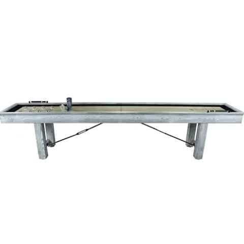 Enhance your game room with the Playcraft Montauk 9′ Shuffleboard Table in stylish whitewash. This table boasts a 5” wide solid hardwood butcher block playfield with a smooth polyurethane finish, ensuring a premium playing surface. Crafted with solid hardwood and black steel turnbuckle hardware, it exudes durability and style. Pro style climate adjusters and adjustable leg levelers provide optimal playing conditions, while the traditional indoor scoring pattern adds a classic touch. The table includes a set of deluxe weights and speed wax for immediate gameplay. Measuring 108″ L x 24″ W x 32″ H and weighing 210 lbs, this shuffleboard table is a must-have for any game room enthusiast.