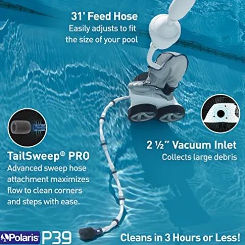 The Polaris P39 Pressure Side Pool Cleaner is a top-of-the-line solution for maintaining the cleanliness of your in-ground pool. This advanced cleaner, designed by Polaris, features an innovative dual chamber zippered SuperBag that circulates an additional 40 gallons of water per minute, ensuring a cleaner and healthier swimming environment. It effectively cleans all pool surfaces, including floors and walls, thanks to its powerful sweeping and scrubbing capabilities. Powered by a booster pump (not included), the Polaris P39 effortlessly picks up debris like leaves, pebbles, and acorns. With its all-wheel PosiDrive system and durable stainless steel drive chain, this cleaner delivers up to 50% more torque for quicker cleaning, improved maneuverability, and fewer snagging points. Keep your pool sparkling with the superior performance of the Polaris P39 Pressure Side Pool Cleaner.