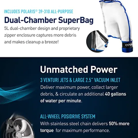 - All-wheel PosiDrive system with durable stainless steel drive chain delivers up to 50% more torque for a faster clean, better maneuverability, and fewer hang-ups.