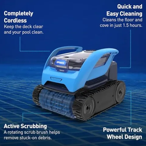 Effortlessly maintain the cleanliness of your pool with the Polaris Pixel Compact Cordless Robotic Pool Cleaner. Designed for both above-ground and in-ground pools up to 30ft, this sleek blue cleaner boasts a long-lasting battery and compact, lightweight build for easy handling. Featuring Cyclonic Vacuum Technology, it efficiently sucks up debris while remaining completely cordless with a convenient one-touch start. The transparent lid allows you to monitor debris levels, while the easy-clean filter canister ensures hassle-free maintenance. With wall-side parking for effortless removal, this Polaris cleaner combines convenience with Polaris’ renowned quality and cleaning power, making it a reliable choice for sparkling pool maintenance.