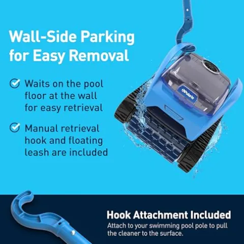 - Wall-Side Parking for Easy Removal: No need to reach when retrieving your cleaner. When cleaning is done, PIXEL automatically waits where the pool floor meets the wall so you can easily remove it with a pole and the included hook attachment.