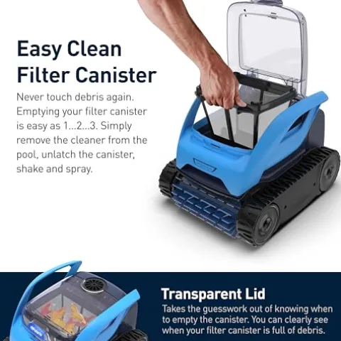 - Easy Clean Filter Canister: Never touch debris again. Emptying your filter canister is easy as 1…2…3. Simply remove the cleaner from the pool, unlatch the canister, shake and spray.