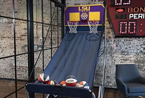 Experience the ultimate basketball arcade game with the Pop-A-Shot Home Dual Shot – Louisiana State University edition. This innovative game offers 10 different games and six audio options for hours of interactive fun. Built with durable 1 ½” steel tubes and a powder-coated finish, this game is designed to last. Its proprietary infrared sensors ensure nearly 100% accurate scoring, while the adjustable height and mobility options make it versatile for various settings. Plus, with a 12-month warranty, you can enjoy playing worry-free. Elevate your game room with this top-of-the-line basketball arcade game.