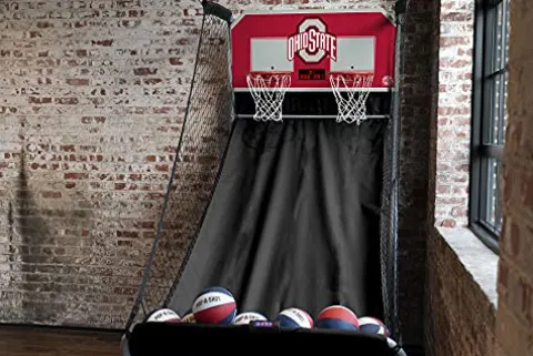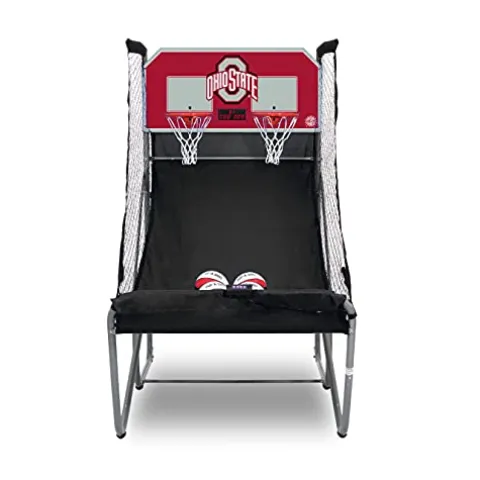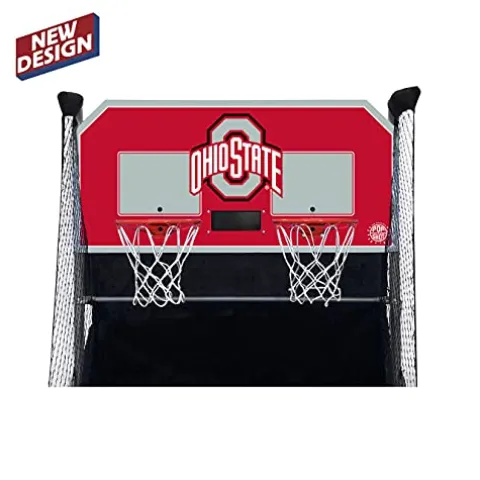 Experience the ultimate basketball arcade game with the Pop-A-Shot Home Dual Shot featuring Ohio State University branding. This innovative game offers 10 different games and six audio options for hours of interactive play. Constructed with durable materials, including sturdy steel tubes and a thick nylon ramp, this game is built to last. The incredibly accurate scoring system, powered by proprietary infrared sensors, ensures nearly 100% accuracy. With customizable height settings, multiple game options, and easy mobility, the Home Dual Shot provides endless entertainment possibilities. Plus, enjoy peace of mind with a 12-month warranty included with every Pop-A-Shot game.