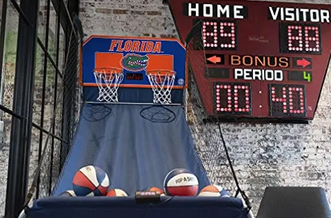 Experience the ultimate basketball arcade game with the Pop-A-Shot – Home Dual Shot – University of Florida. This multicolored game by Pop-A-Shot offers 10 different games and six audio options, promising hours of interactive gameplay. Built with sturdy steel tubes and a powder coating for durability, the Home Dual Shot features a thick nylon ramp and a robust frame that sets it apart from other basketball arcade games. Enjoy accurate scoring with proprietary infrared sensors and a large scoreboard, while the adjustable height and mobility options cater to various settings and ceiling heights. Whether powered by battery or AC adapters, this game is easy to transport with its wheels. Plus, rest assured with a 12-month warranty for worry-free play.