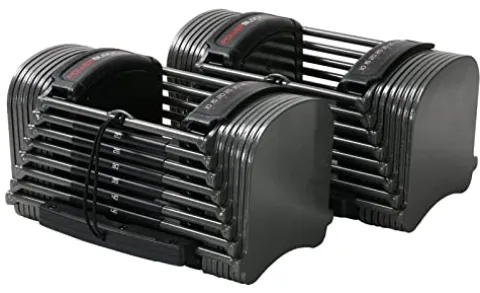 - ADJUSTABLE DUMBBELLS SET: Elevate your fitness and performance with strength-training equipment that adjusts with you. These PowerBlock dumbbells have a range of 10-50 pounds per hand, a rubber grip handle, and easy weight identification.