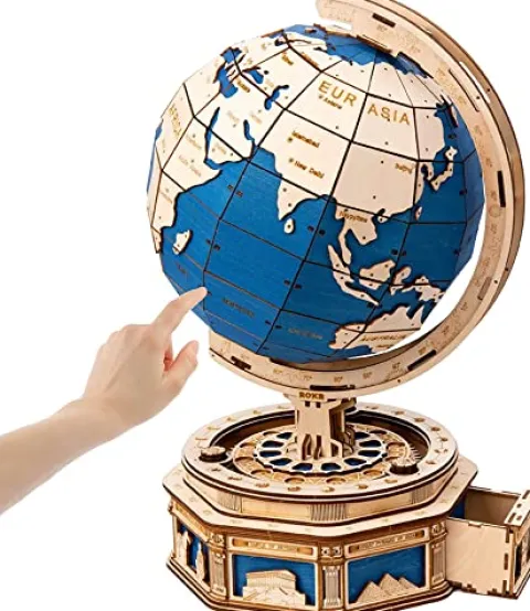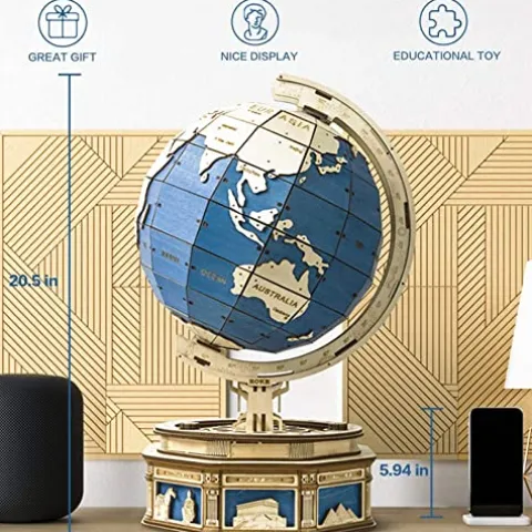 Embark on an engaging journey with the PRODCA 3D Wooden Puzzle Globe, a captivating model kit designed for adults and teens. Comprising 567 intricately crafted pieces, this puzzle offers an immersive 8-hour experience that fosters patience, teamwork, and connection when completed with loved ones. Featuring silk-screen technology, the globe showcases a stunning ocean blue with wood-toned continents, enhanced by patterns depicting the eight wonders of the world. Discover hidden storage spaces amidst the intricately detailed 12 constellations as you rotate the globe, offering an educational exploration of geography, constellations, and architecture. Perfect as an educational gift or a unique pastime, this wooden puzzle is a delightful blend of learning and craftsmanship, promising both challenge and excitement for puzzle enthusiasts.