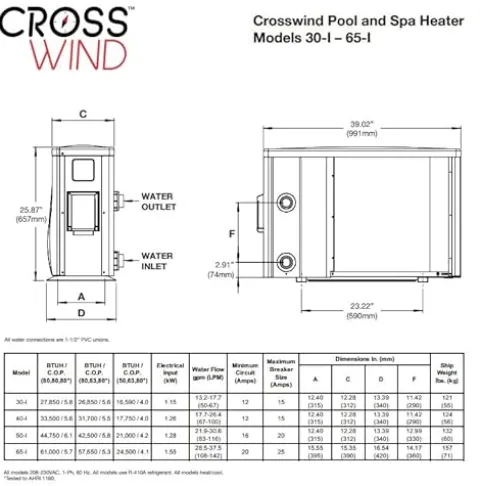 Efficiently heat or cool your pool with the Raypak Crosswind Model 40i Heat/Cool Electric Pool Heat Pump. This versatile unit features inverter technology, providing 33,000 BTU for effective temperature control. Its spiral titanium heat exchanger ensures durability, while the inverter compressor and low-speed fan motor offer whisper-quiet operation for a tranquil pool or spa environment. With an LCD display digital control and WiFi capability, this heat pump is designed for both above ground and in ground pools, delivering convenience and performance in one sleek black unit.